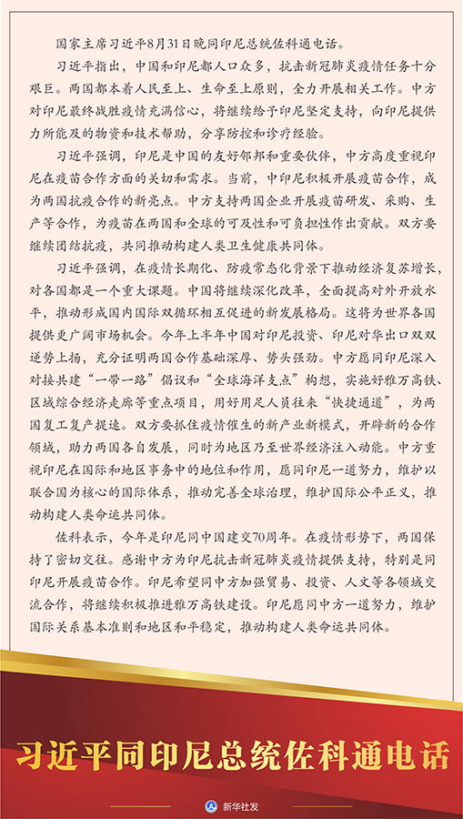 習近平指出,中國和印尼都人口眾多,抗擊新冠肺炎疫情任務(wù)十分艱巨。兩國都本著人民至上、生命至上原則,全力開展相關(guān)工作。中方對印尼最終戰(zhàn)勝疫情充滿信心,將繼續(xù)給予印尼堅定支持,向印尼提供力所能及的物資和技術(shù)幫助,分享防控和診療經(jīng)驗。