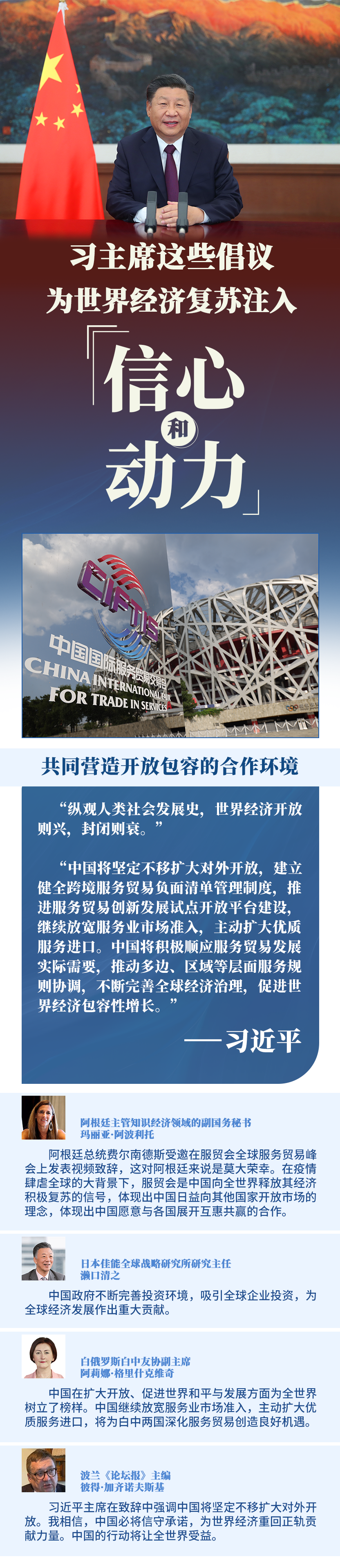 在全球范圍新冠疫情尚未得到全面控制、經(jīng)濟全球化遭遇逆流的背景下,習(xí)主席就促進(jìn)全球服務(wù)業(yè)開放合作提出3點倡議,為推動世界經(jīng)濟盡快復(fù)蘇注入信心和動力,向國際社會展現(xiàn)中國負(fù)責(zé)任大國的作為和擔(dān)當(dāng)。
