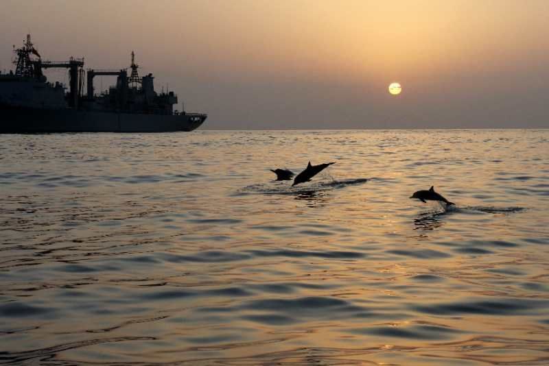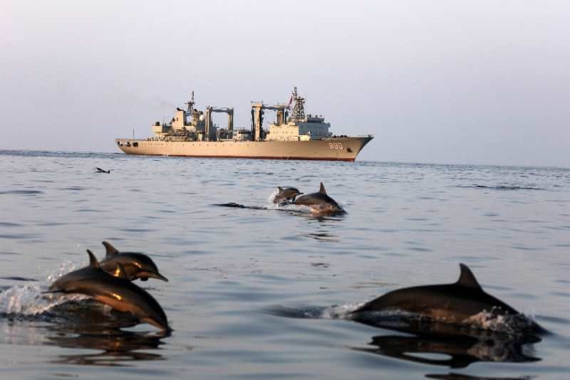 中國海軍赴亞丁灣索馬里海域護(hù)航編隊(duì)始終秉持海洋命運(yùn)共同體理念,堅持人與大海和諧相處,注重生態(tài)環(huán)境保護(hù),贏得大自然積極回報,經(jīng)常出現(xiàn)編隊(duì)艦艇航行時有成群海豚伴航、待機(jī)集結(jié)時有各類魚群相伴的和諧場景。