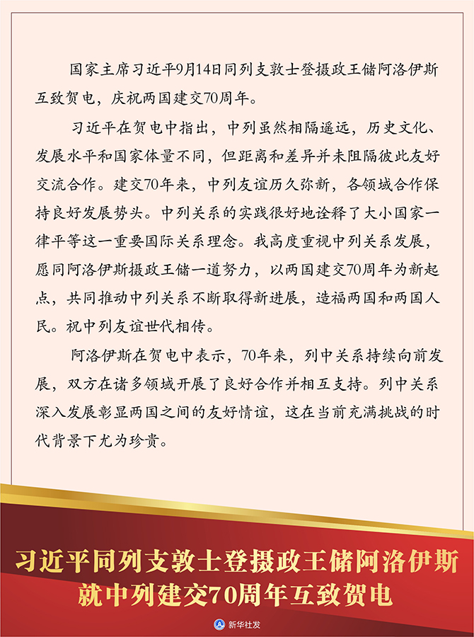 習(xí)近平在賀電中指出,中列雖然相隔遙遠,歷史文化、發(fā)展水平和國家體量不同,但距離和差異并未阻隔彼此友好交流合作。建交70年來,中列友誼歷久彌新,各領(lǐng)域合作保持良好發(fā)展勢頭。中列關(guān)系的實踐很好地詮釋了大小國家一律平等這一重要國際關(guān)系理念。我高度重視中列關(guān)系發(fā)展,愿同阿洛伊斯攝政王儲一道努力,以兩國建交70周年為新起點,共同推動中列關(guān)系不斷取得新進展,造福兩國和兩國人民。祝中列友誼世代相傳。