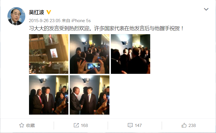 時(shí)任聯(lián)合國副秘書長吳紅波說,習(xí)主席走下講臺時(shí),二三十位其他國家領(lǐng)導(dǎo)人排隊(duì)與他握手表示祝賀,走廊里擠得滿滿當(dāng)當(dāng)。