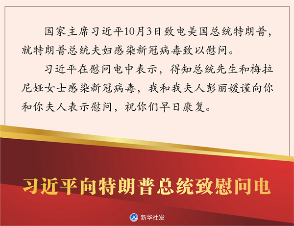 新華社北京10月3日電? 國(guó)家主席習(xí)近平10月3日致電美國(guó)總統(tǒng)特朗普,就特朗普總統(tǒng)夫婦感染新冠病毒致以慰問。