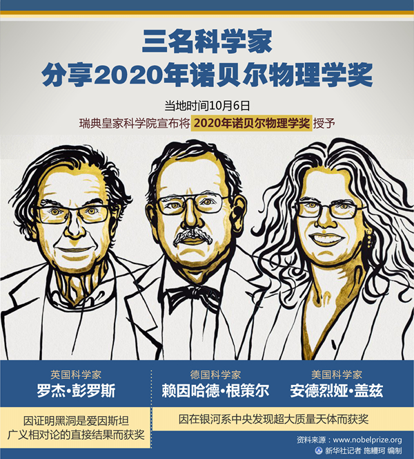 新華社斯德哥爾摩10月6日電(記者和苗 付一鳴)瑞典皇家科學院6日宣布,將2020年諾貝爾物理學獎授予三名科學家。英國科學家羅杰·彭羅斯因證明黑洞是愛因斯坦廣義相對論的直接結果而獲獎;德國科學家賴因哈德·根策爾和美國科學家安德烈婭·蓋茲因在銀河系中央發(fā)現超大質量天體而獲獎。