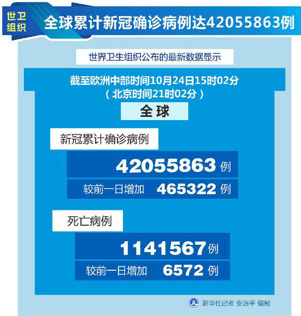 新華社日內(nèi)瓦10月24日電(記者劉曲)世界衛(wèi)生組織24日公布的最新數(shù)據(jù)顯示,全球累計新冠確診病例達42055863例。