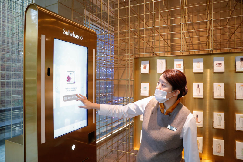 10月27日,工作人員在位于韓國(guó)首爾江南區(qū)的愛茉莉太平洋雪花秀旗艦店內(nèi)指導(dǎo)客人體驗(yàn)店內(nèi)設(shè)施。總部位于韓國(guó)首爾的美妝企業(yè)愛茉莉太平洋集團(tuán)今年將連續(xù)第三次參加進(jìn)博會(huì)。新華社記者 王婧嬙 攝