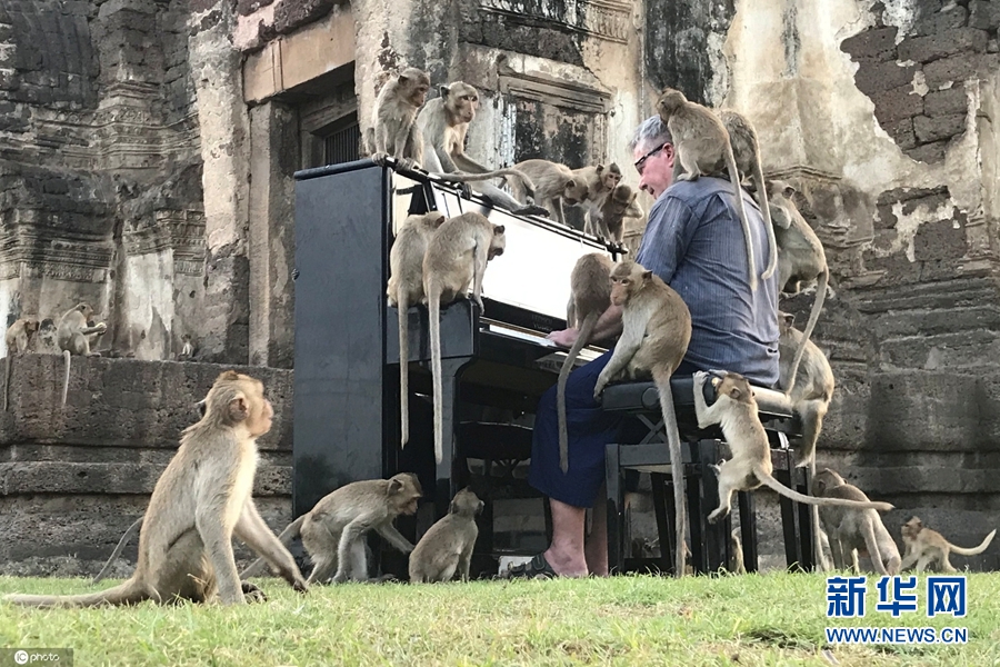 11月21日,泰國華富里府,英國鋼琴家保羅·巴頓(Paul Barton)為一群猴子彈鋼琴。演奏過程中,多只猴子在他周圍跑來跑去,有幾只還爬上了鋼琴,甚至在他的頭頂跳來跳去。巴頓稱,這場特殊的音樂會(huì)旨在引起人們對(duì)這群饑餓的猴子的重視。(圖片來源:東方IC)