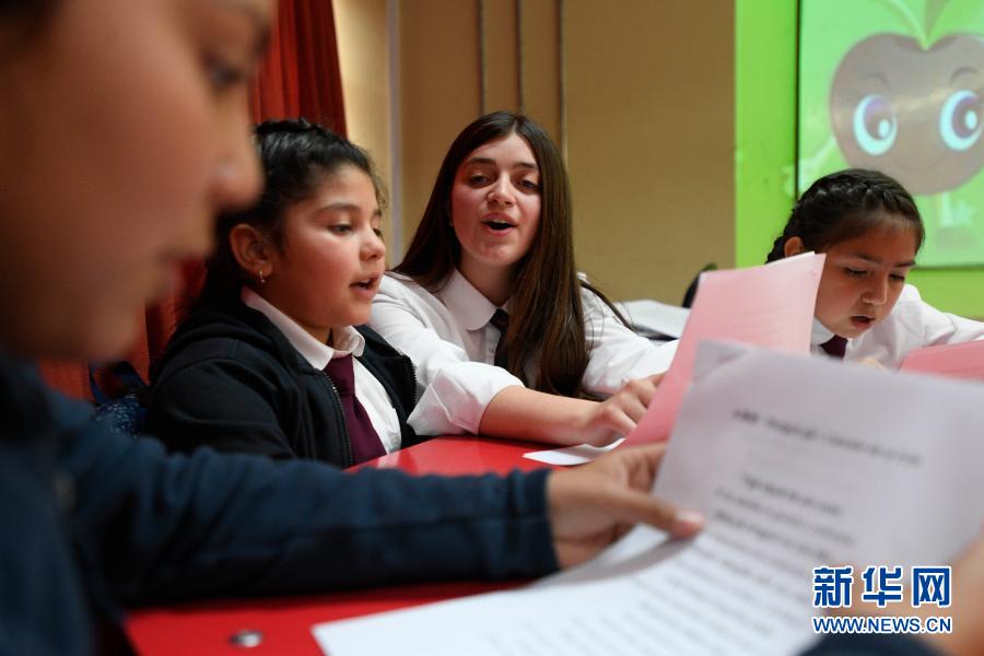 2019年10月11日,洛蕾托·約斯(右二)在智利南部紐夫萊大區(qū)的圣尼古拉斯中學(xué)利用課外時間教授低年級學(xué)生漢語。新華社發(fā)(豪爾赫·比列加斯攝)