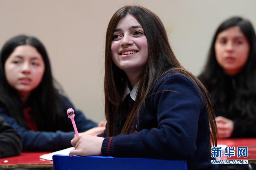 2019年10月11日,洛蕾托·約斯(中)在智利南部紐夫萊大區(qū)的圣尼古拉斯中學(xué)的課堂上學(xué)習(xí)漢語。新華社發(fā)(豪爾赫·比列加斯攝)