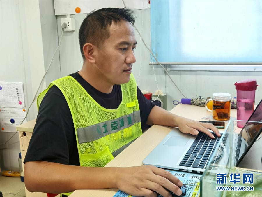 12月14日,在馬爾代夫馬累,臉上有口罩印的安全工程師劉平建在維拉納國(guó)際機(jī)場(chǎng)水飛航站樓項(xiàng)目辦公室工作。新華社發(fā)(北京城建集團(tuán)供圖)