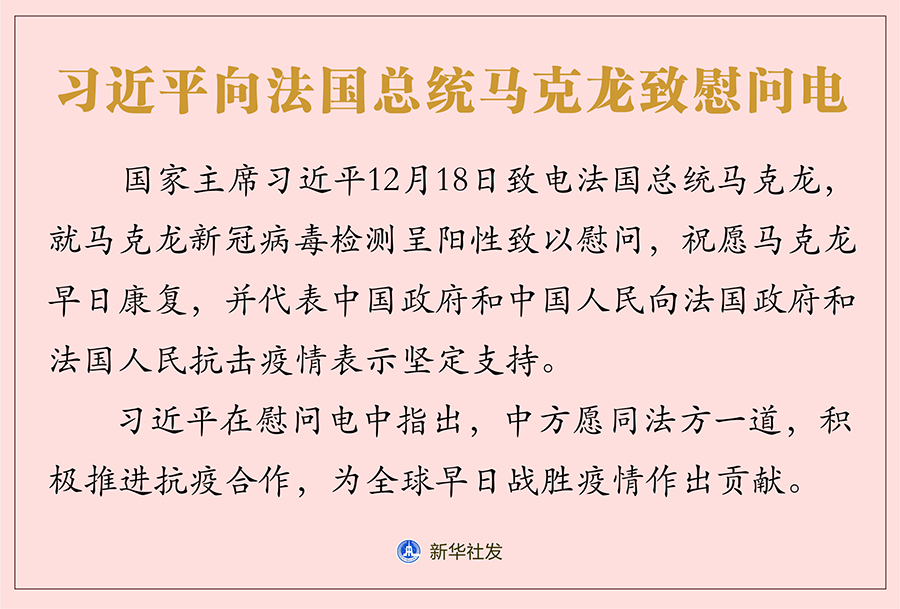 新華社北京12月18日電 國家主席習(xí)近平18日致電法國總統(tǒng)馬克龍,就馬克龍新冠病毒檢測呈陽性致以慰問,祝愿馬克龍?jiān)缛湛祻?fù),并代表中國政府和中國人民向法國政府和法國人民抗擊疫情表示堅(jiān)定支持。