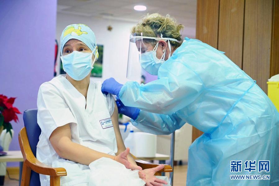 12月27日,護(hù)工莫妮卡·塔皮亞斯(左)在西班牙瓜達(dá)拉哈拉的洛斯奧爾莫斯養(yǎng)老院內(nèi)接受新冠疫苗注射。新華社發(fā)(西班牙首相府供圖)