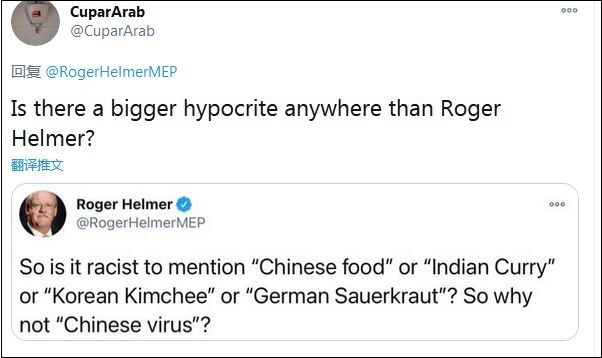 不少網(wǎng)友指出了赫爾默的雙標(biāo)?!白h員先生,你管這(新冠病毒)叫‘中國病毒’,為什么不也把它叫做英國病毒?”