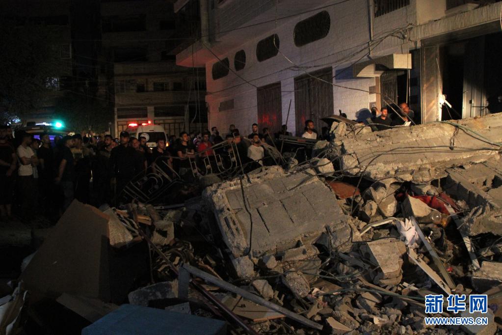 5月15日,人們聚集在加沙城一處遭空襲的難民營(yíng)。
