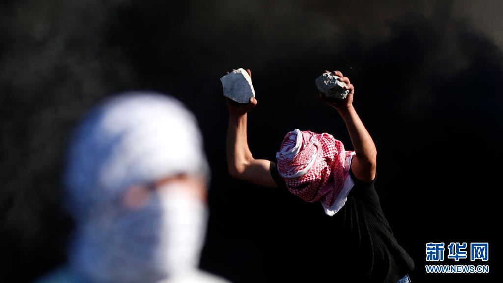 5月18日,一名巴勒斯坦示威者在約旦河西岸城市納布盧斯附近的沖突中手持石塊。