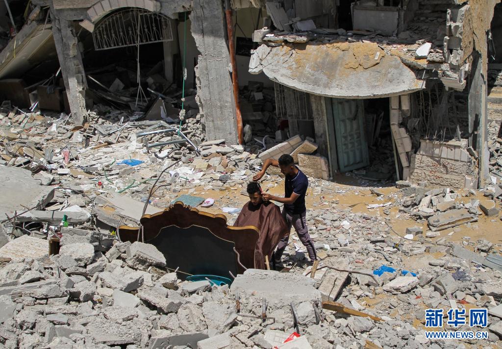 5月26日,在加沙地帶北部的城鎮(zhèn)貝特拉希亞,23歲的巴勒斯坦理發(fā)師阿卜杜拉·扎瓦拉在他被以色列炸毀的房屋前為顧客免費服務。 新華社發(fā)(里澤克·阿卜杜勒·賈瓦德攝)