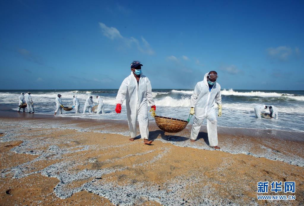 6月2日,工作人員在斯里蘭卡科倫坡一處沙灘清理貨船燃燒產(chǎn)生的廢物。