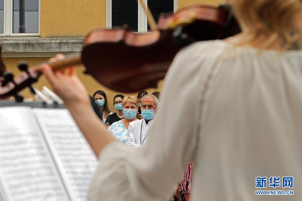 當日,羅馬尼亞首都布加勒斯特一個樂隊在該國一家傳染病醫(yī)院——馬太·巴爾什醫(yī)院演出,向抗擊新冠疫情的醫(yī)務工作者致謝。