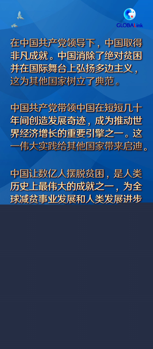 “新中國成立之時(shí),中國還很貧窮。中國共產(chǎn)黨帶領(lǐng)中國在短短幾十年間創(chuàng)造發(fā)展奇跡,成為推動(dòng)世界經(jīng)濟(jì)增長的重要引擎之一。這一偉大實(shí)踐給其他國家?guī)韱⒌稀!?/p>