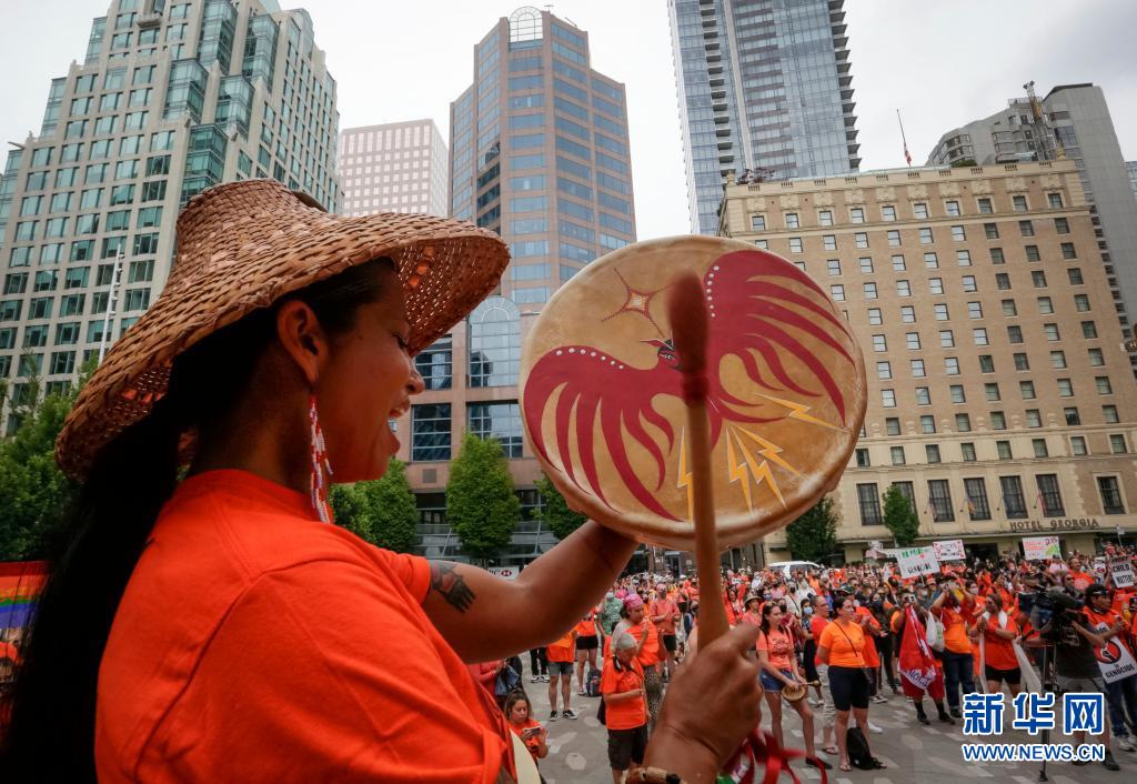 7月1日,原住民社團成員在加拿大溫哥華舉行的集會上敲響原住民文化圖案的手鼓。